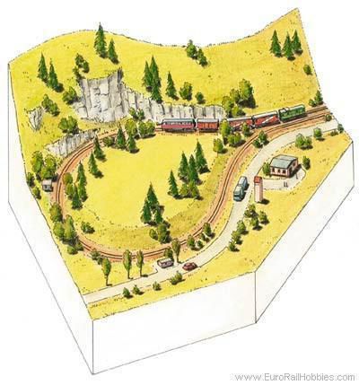 Contents: Scenery material and wood as described above and the following Minitrix track: 4 sections of straight track 14902 2 sections of curved track 14904 2 sections of straight track 14905 2 sections of straight track 14906 3 pairs of feeder wire rail joiners 66520 1 package of insulated rail joiners (6 pieces) 66539 Length 858 mm / 33-3/4 Width 429 mm / 16-7/8.