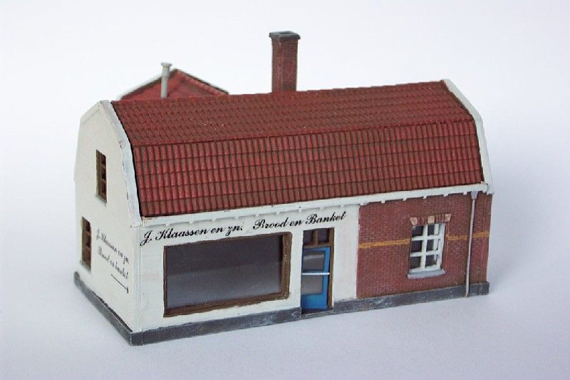 Model van een huis met mansardedak waarin een bakkerij is gevestigd