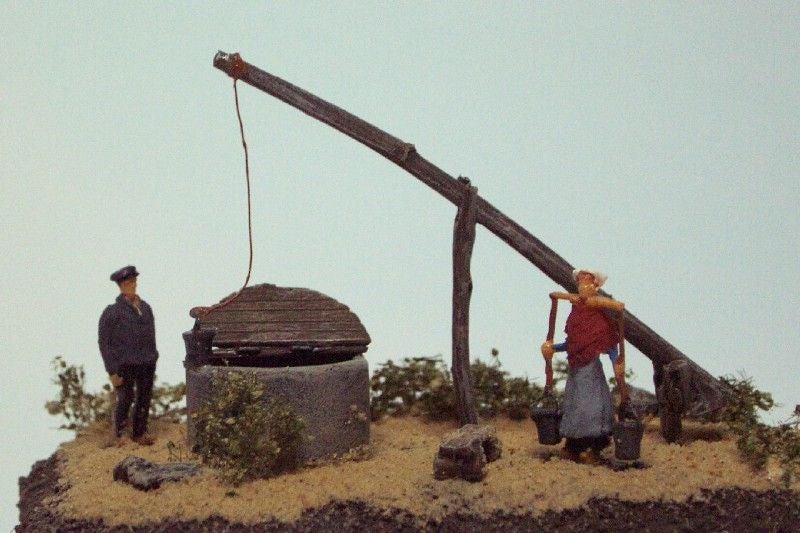 waterput met figuren: een hollandse boer en een boerin met juk en emmers